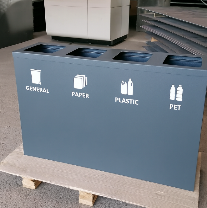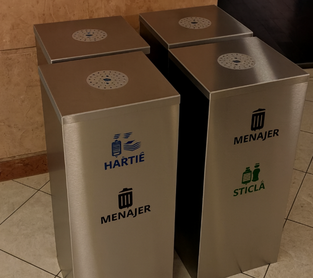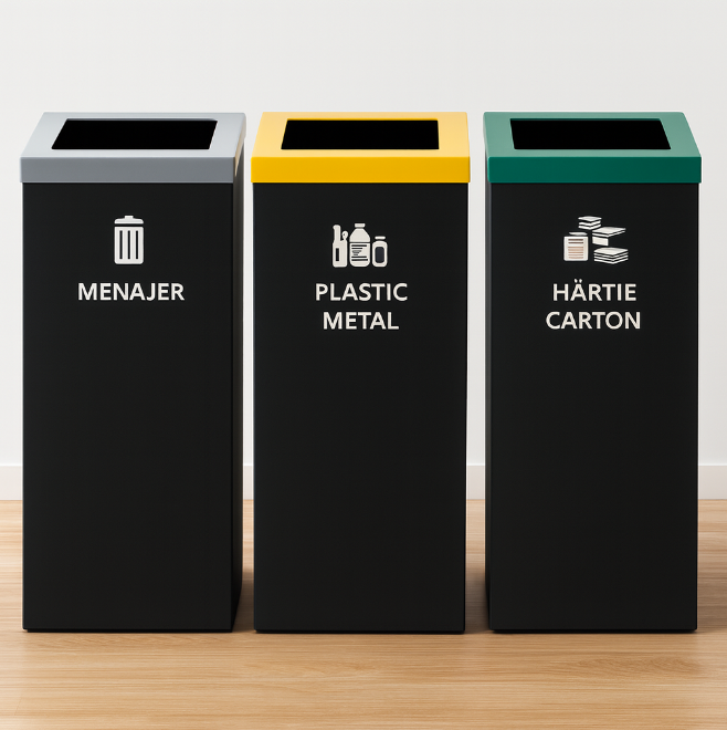 Disponibile în versiuni simple sau compartimentate (pentru colectare selectivă), coșurile sunt realizate din materiale rezistente la intemperii, dotate cu elemente antivandalism și pot fi ancorate în pardoseală sau amplasate liber. Etichetarea este vizibilă și standardizată, pentru a corespunde legislației în vigoare privind codurile deșeurilor.