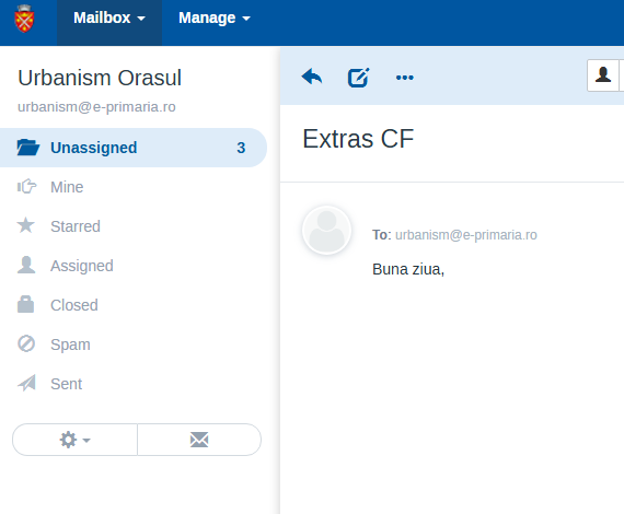 Partajarea adreselor de e-mail, gestionarea e-mailurilor primite in cadrul departamentelor, si posibilitatea de a functiona ca un sistem de ticketing, in care fiecare departament sa acceseze solicitarile primite via e-mail. La o adresa de e-mail generica pot avea acces mai multi utilizatori din cadrul institutiei pentru o gestionare rapida a solicitarilor. Fiecare e-mail primeste un numar unic de inregistrare si poate fi transferat rapid in functie de departamentul caruia i se adreseaza pentru o oragnizare mai buna a unui flux mare de solicitari primite de catre institutie.