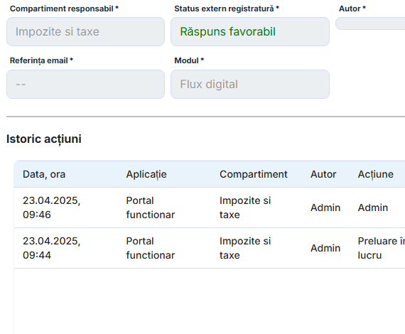 Prin digitalizarea completă a fluxurilor, instituțiile elimină formularele pe hârtie, timpul pierdut cu transmiterea manuală a documentelor și blocajele cauzate de lipsa vizibilității asupra stadiului în care se află o solicitare. Platforma permite trasabilitate completă - fiecare acțiune este înregistrată și poate fi urmărită în timp real, cu responsabil, dată, oră și observații.
